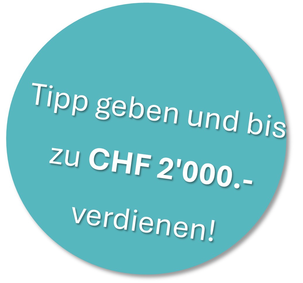 Wenn Ihr Hinweis zu einem erfolgreichen Abschluss führt, sichern Sie sich als Tippgeber eine attraktive Provision von CHF 2’000.–. Die Auszahlung erfolgt unkompliziert nach dem rechtsgültigen Vertragsabschluss und gemäß den vereinbarten Bedingungen. Für Sie entstehen dabei keinerlei Kosten oder Verpflichtungen – mit Ihrem Tipp können Sie also ganz einfach profitieren!